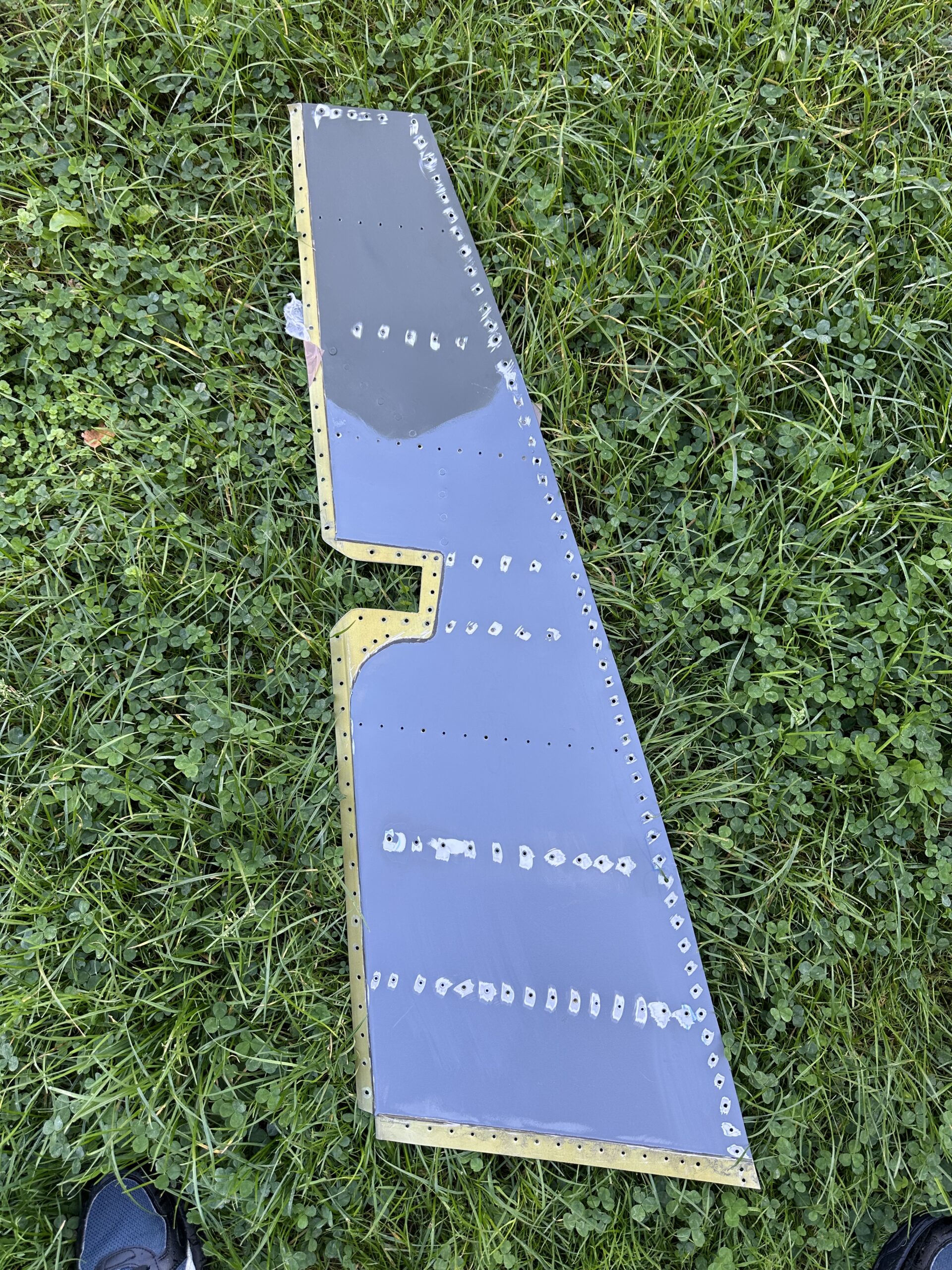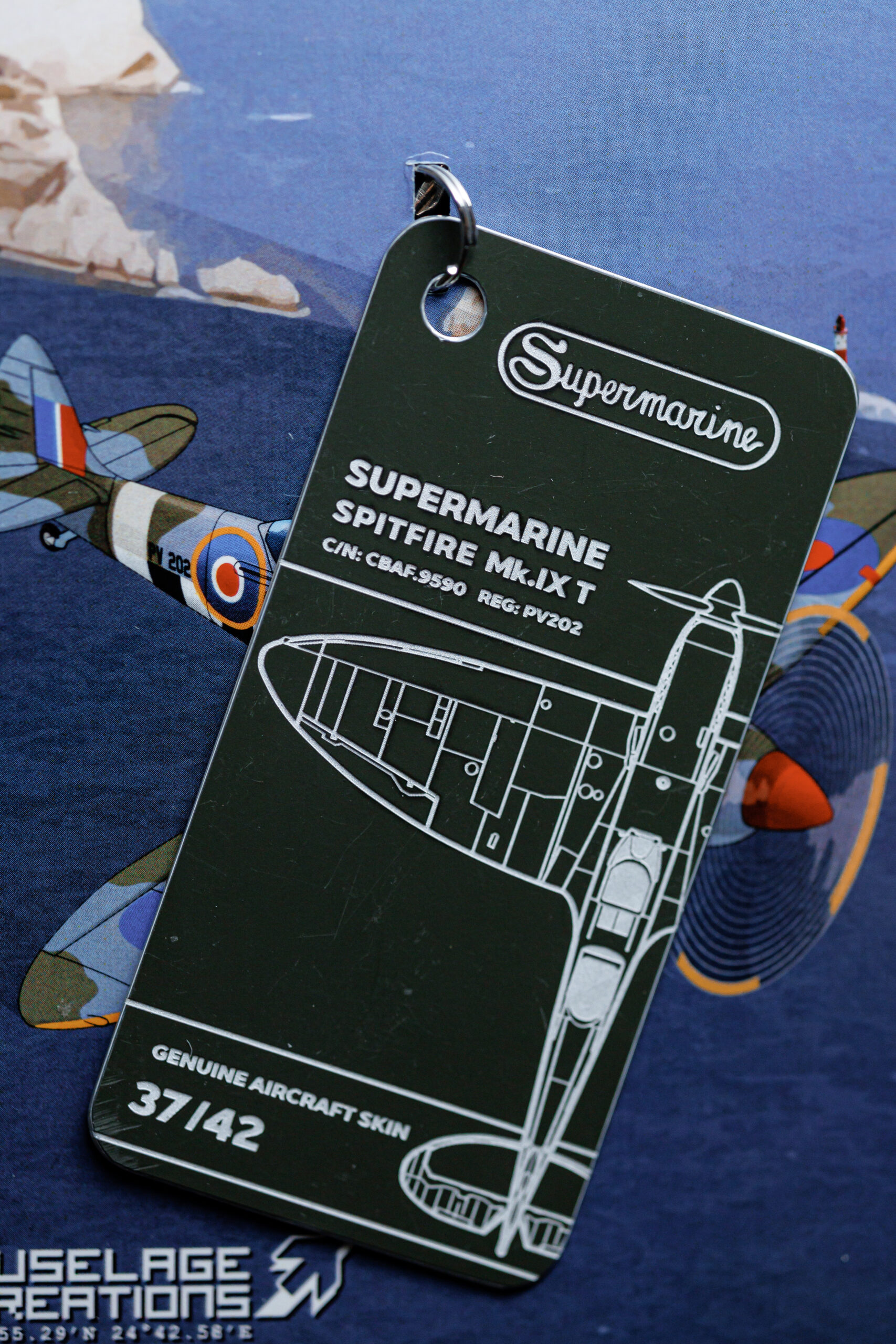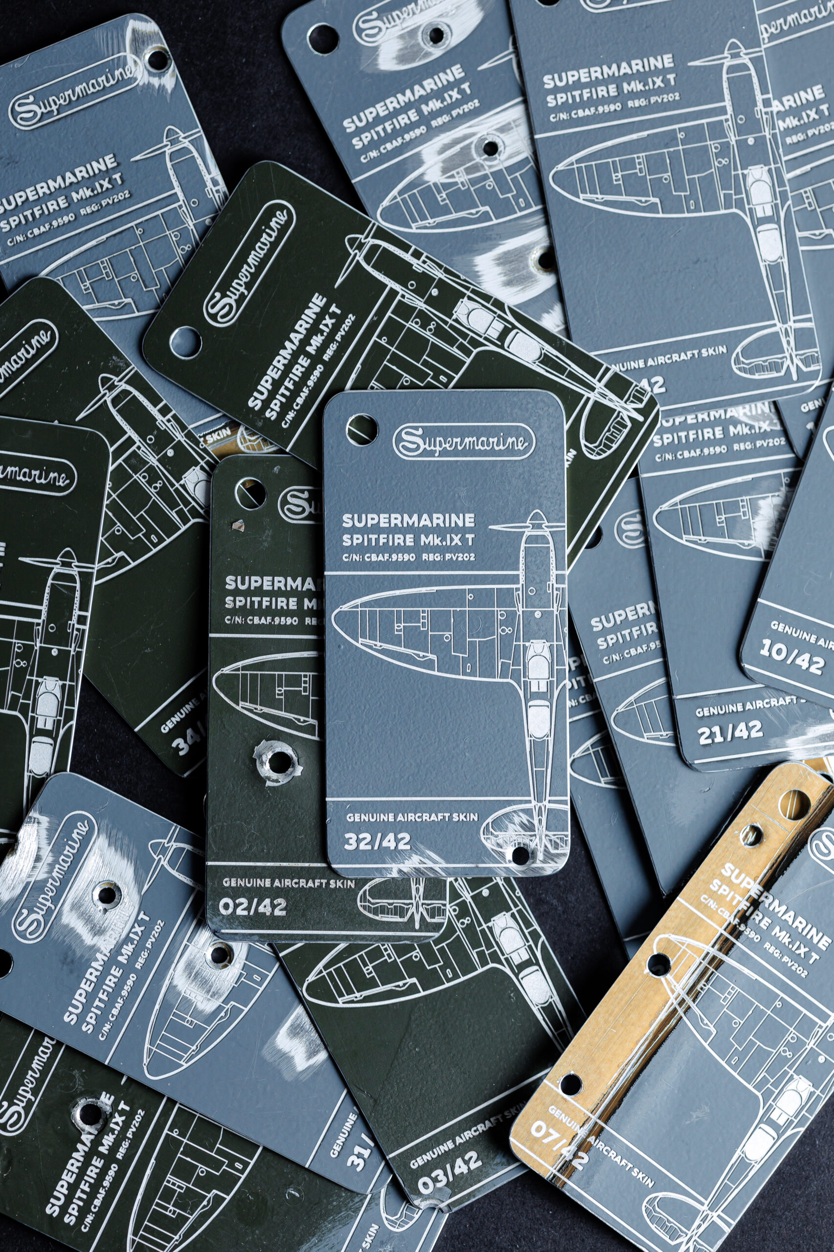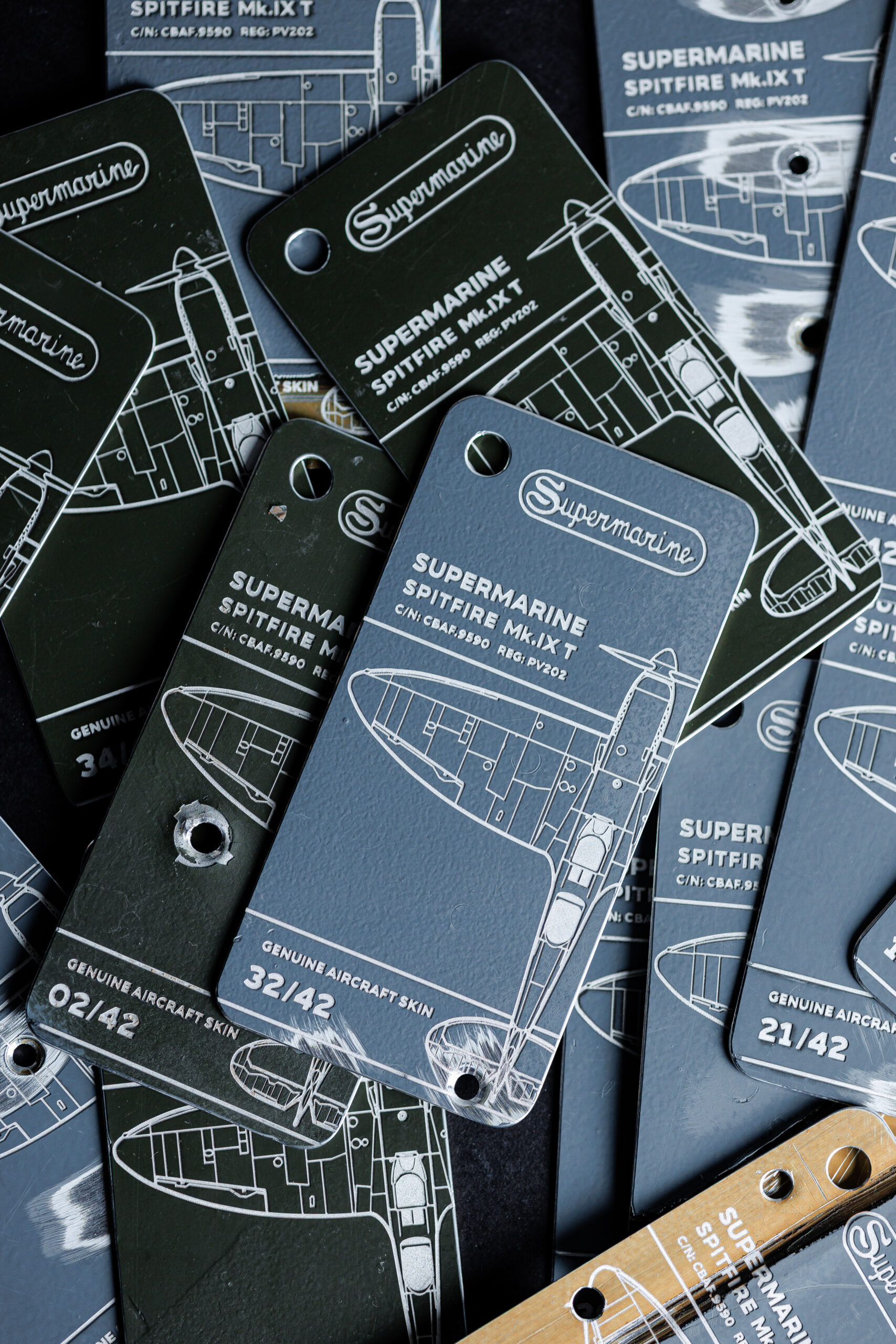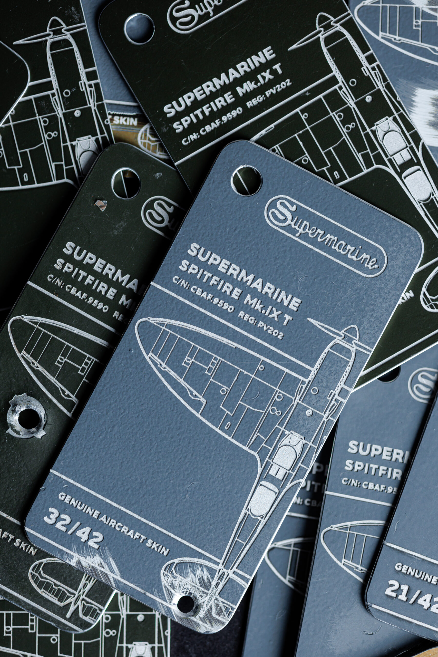 The tag in your possession has been crafted from the starboard aileron upper skin of Spitfire T9 PV202/G-CCCA, removed during the aircraft’s overhaul.