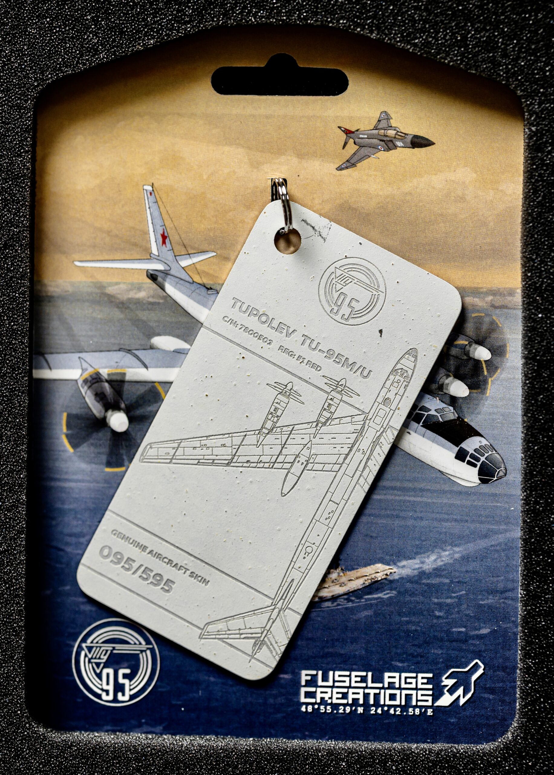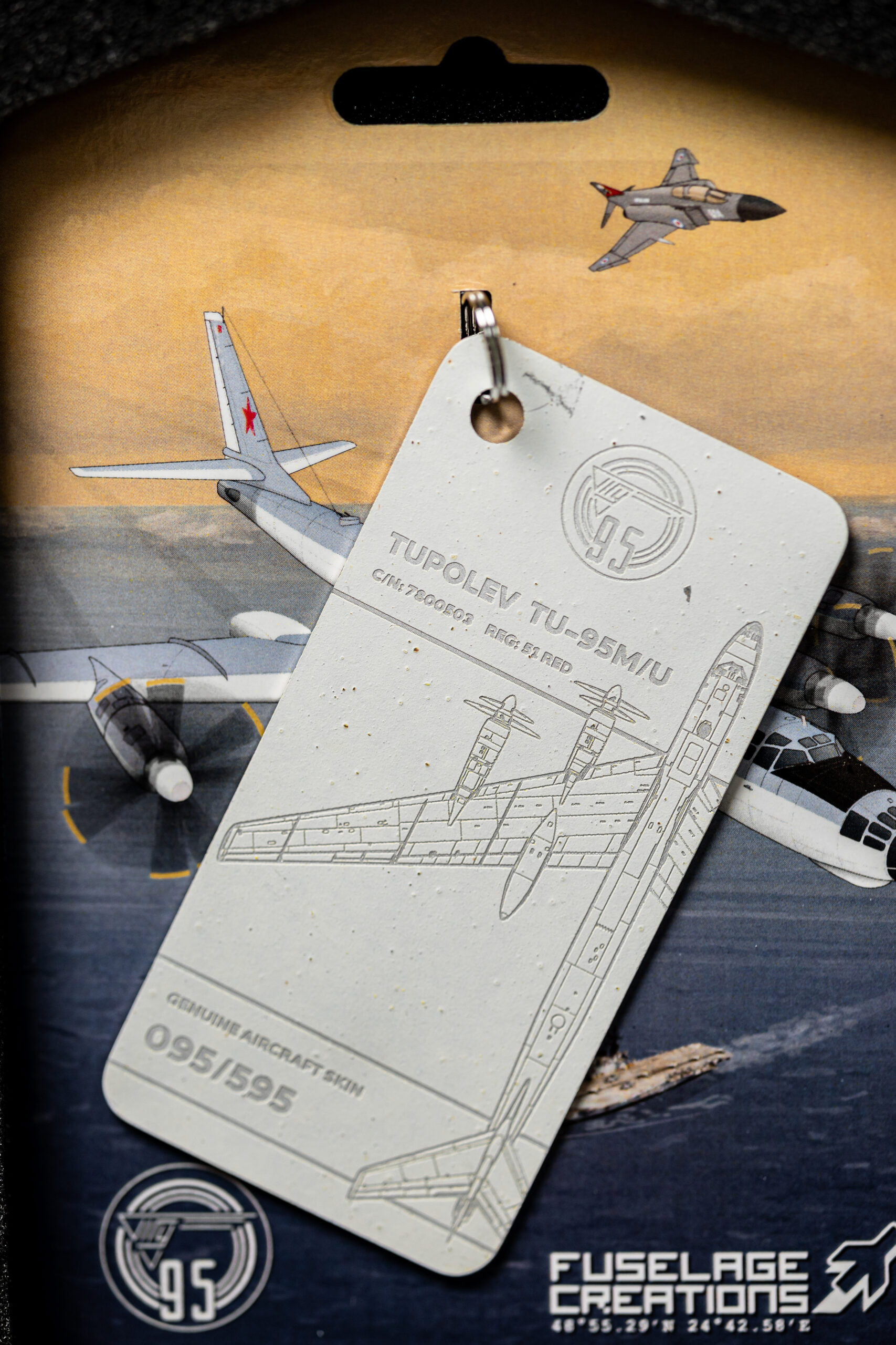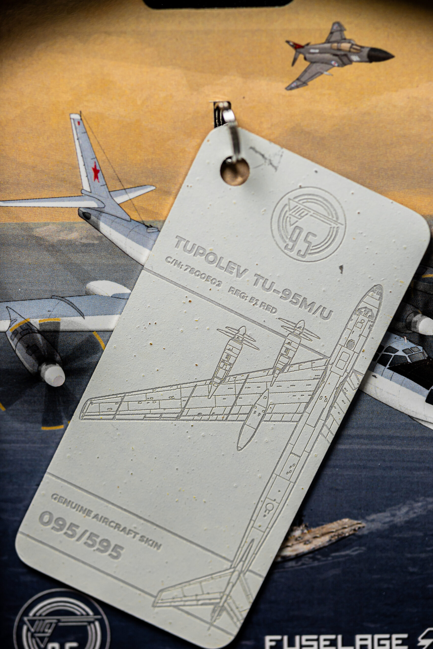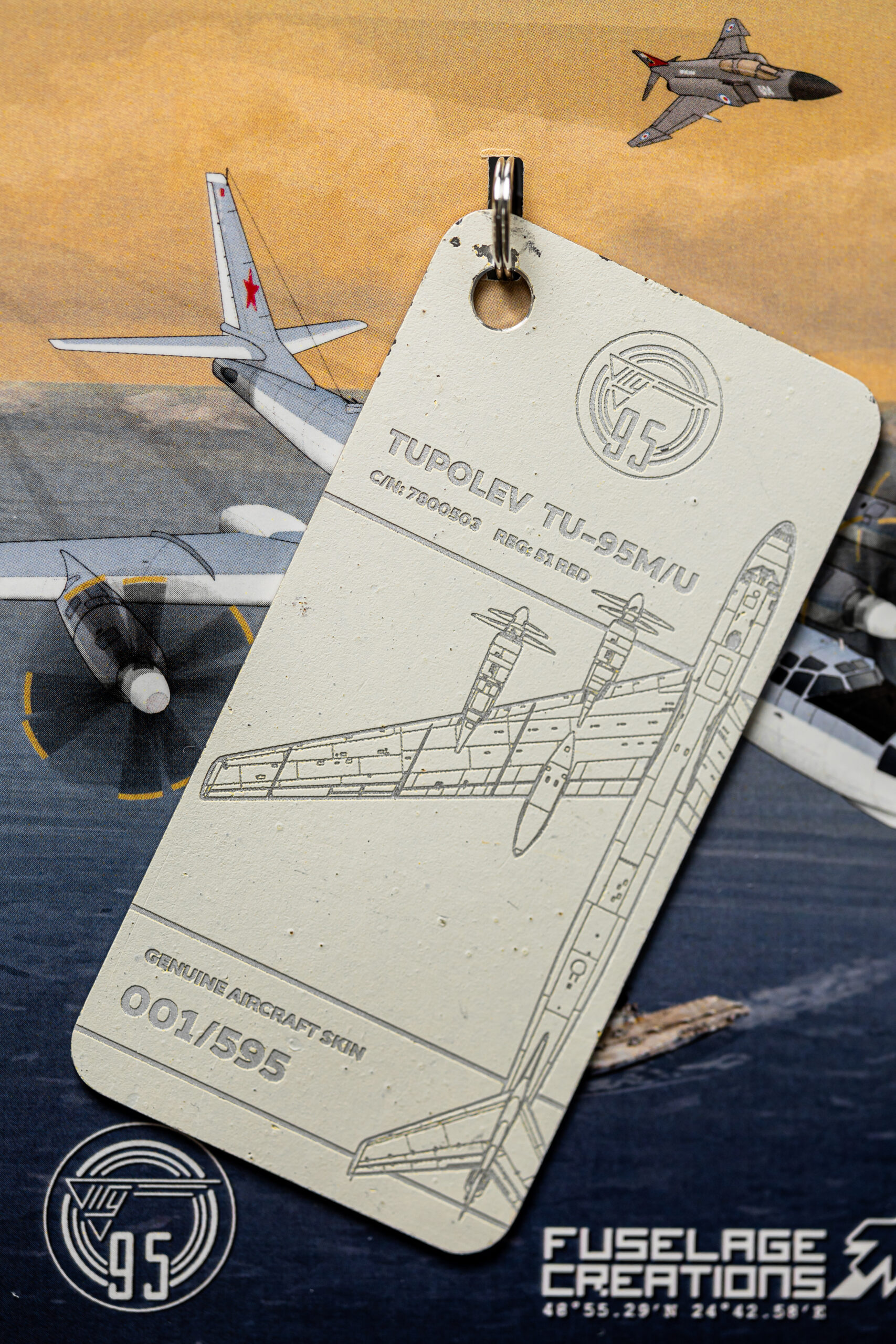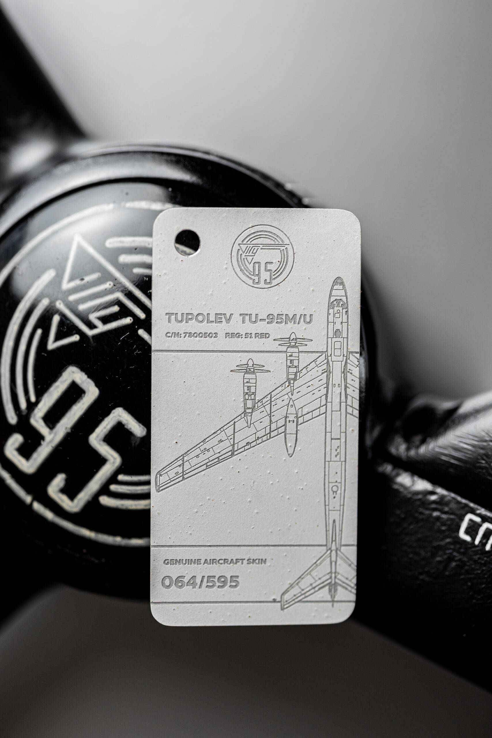 The tag in your possession has been crafted from the tail rudder of one of only two remaining TU-95M aircraft in the world. The TU-95M (Bear-A), with factory number 7800503 and military designator 51, was manufactured on 28 February 1958. Shortly after, the aircraft was delivered to the 409th Heavy Bomber Aviation Regiment, stationed at Uzyn Air Base (Ukrainian Soviet Socialist Republic).