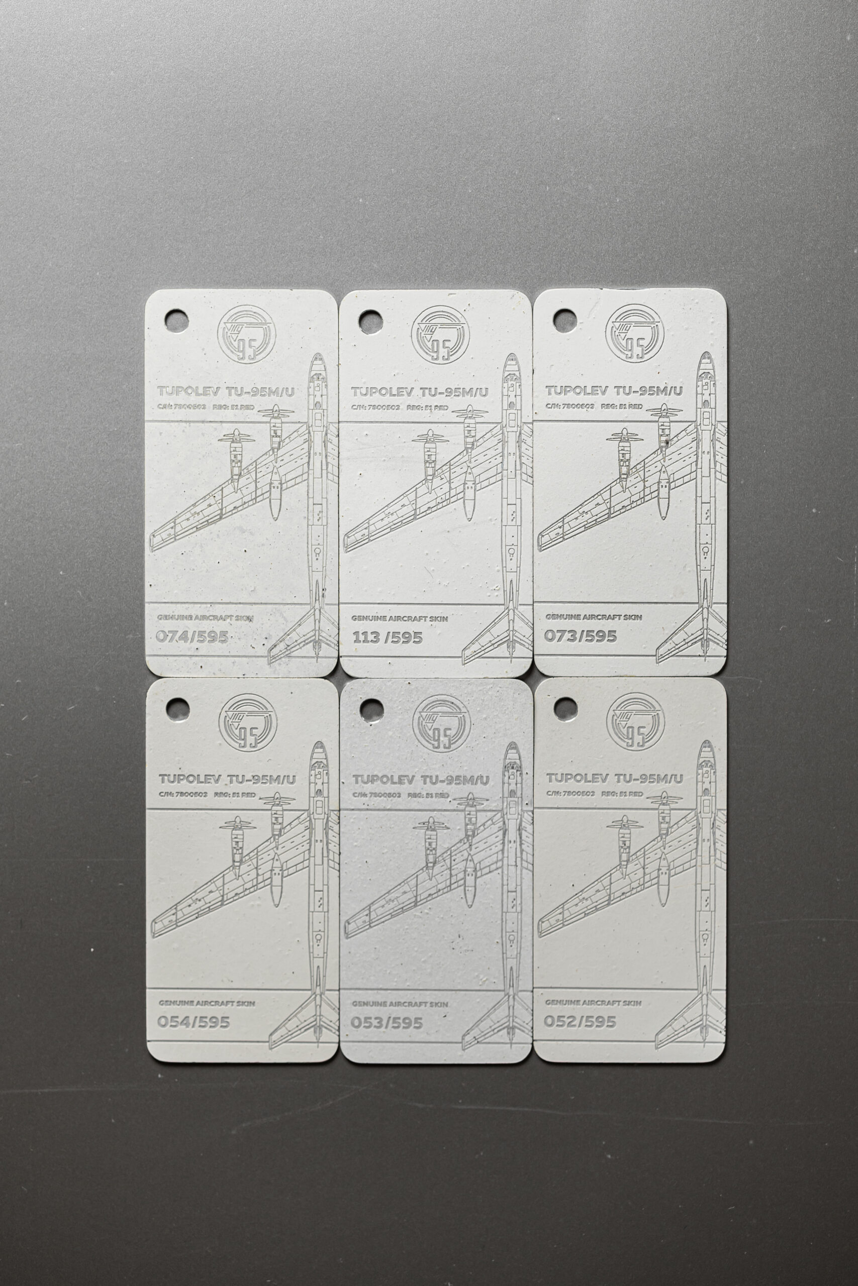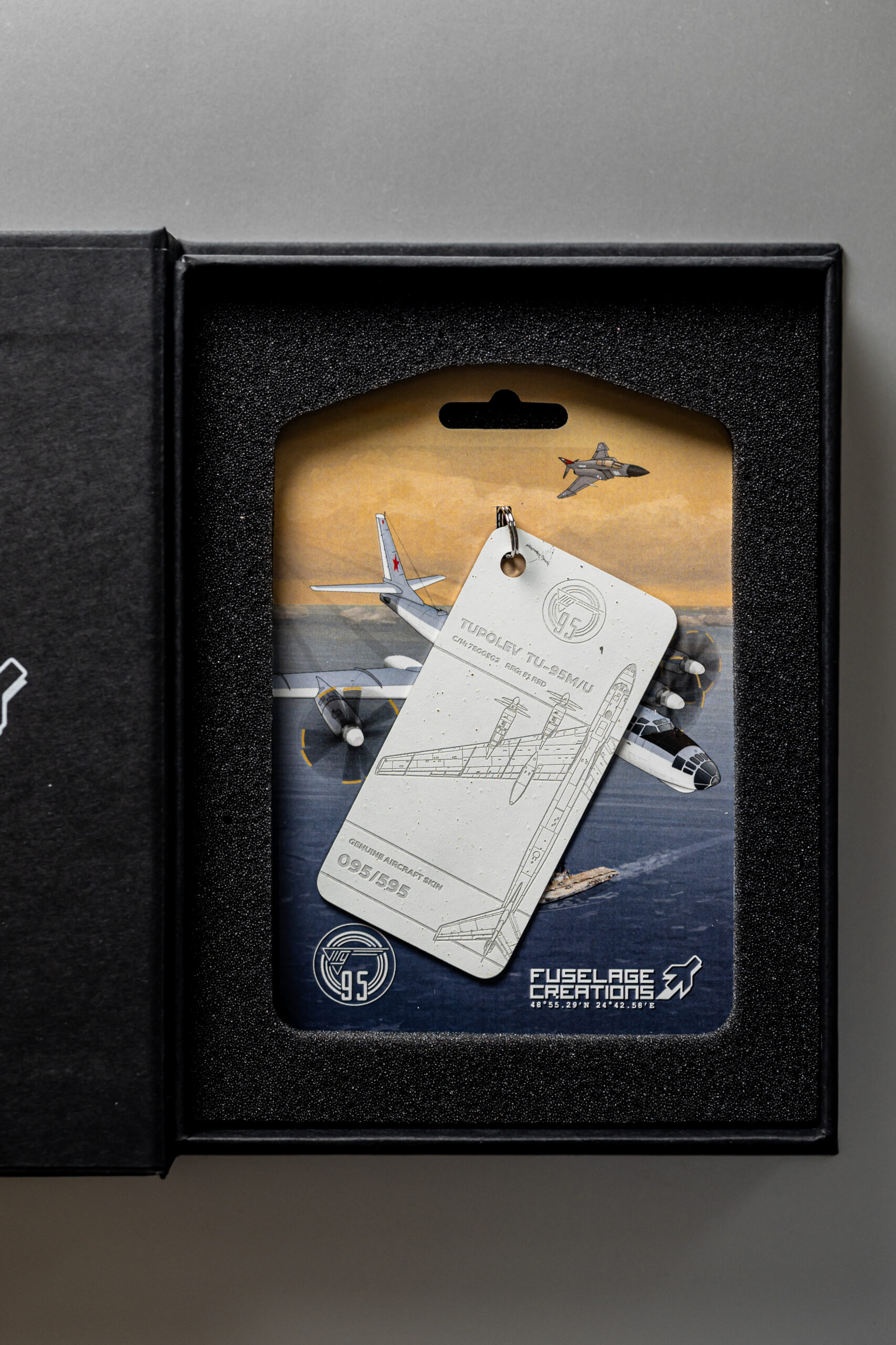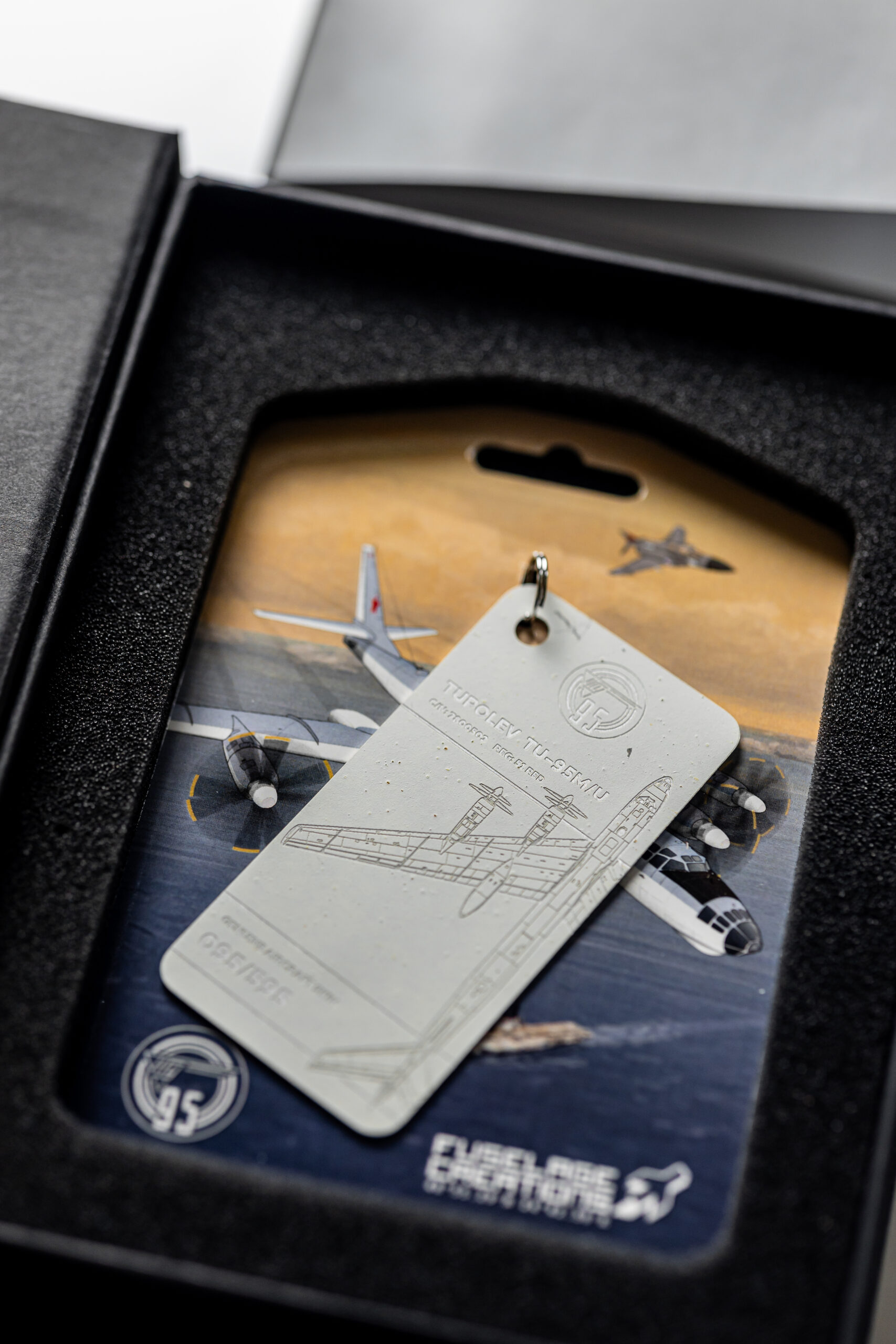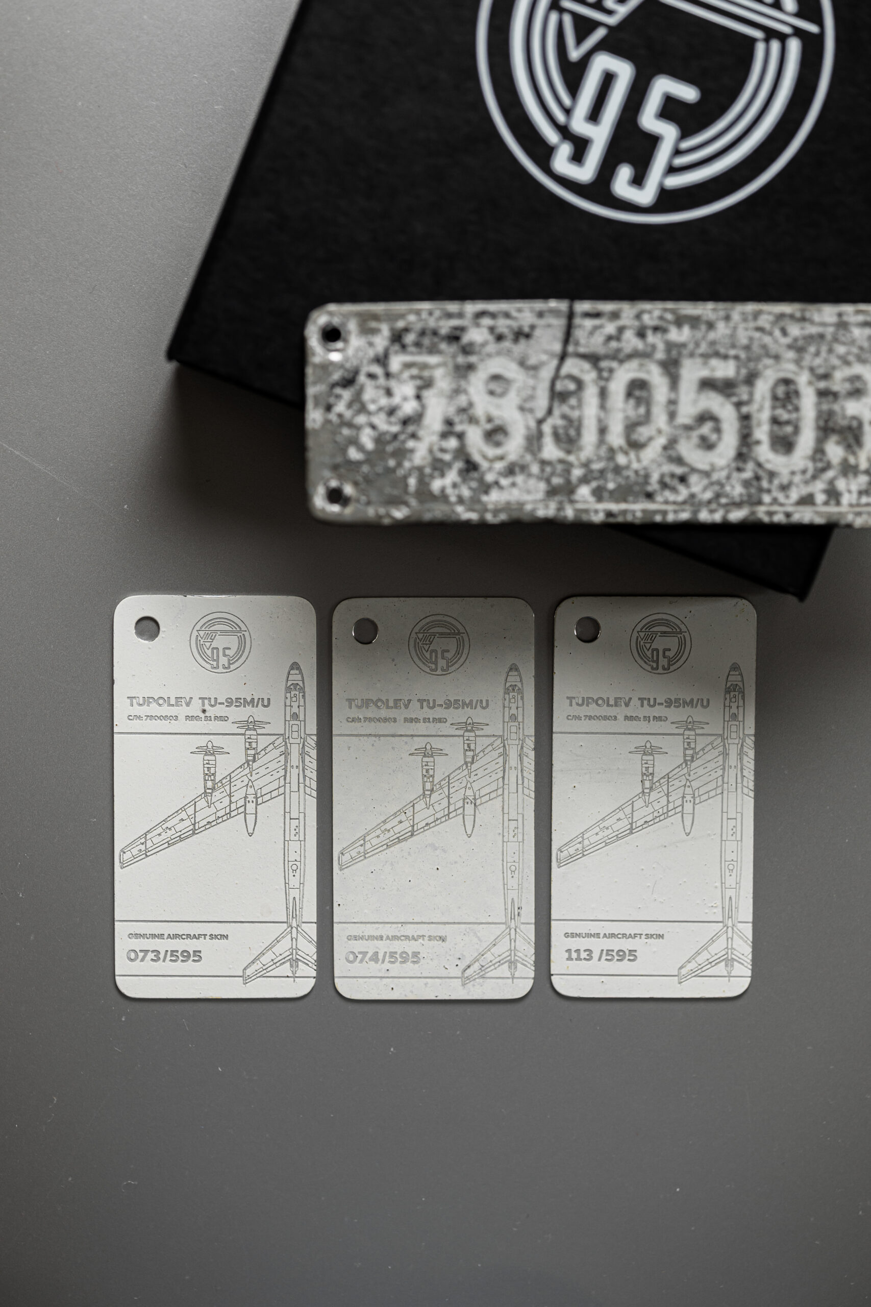 The tag in your possession has been crafted from the tail rudder of one of only two remaining TU-95M aircraft in the world. The TU-95M (Bear-A), with factory number 7800503 and military designator 51, was manufactured on 28 February 1958. Shortly after, the aircraft was delivered to the 409th Heavy Bomber Aviation Regiment, stationed at Uzyn Air Base (Ukrainian Soviet Socialist Republic).