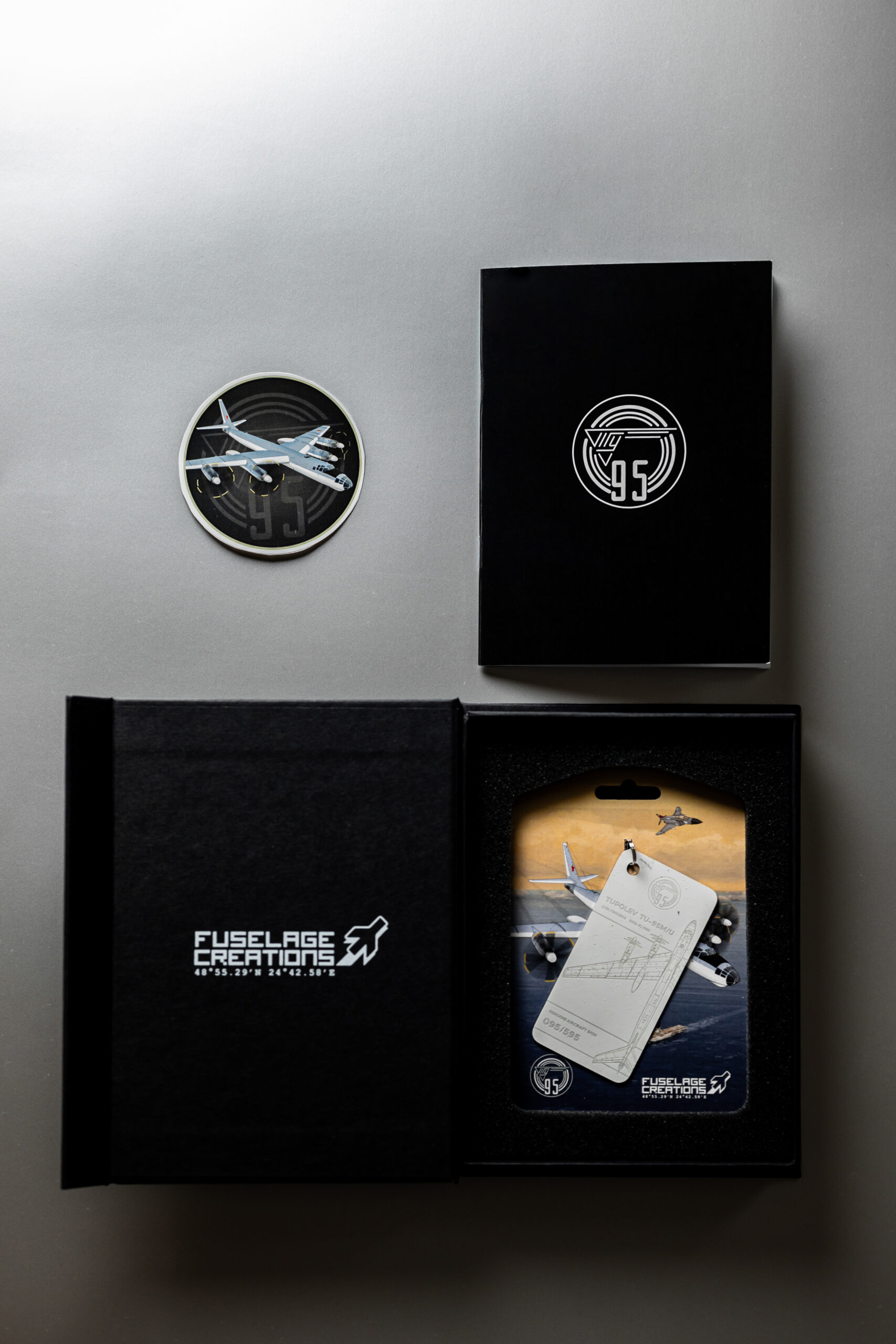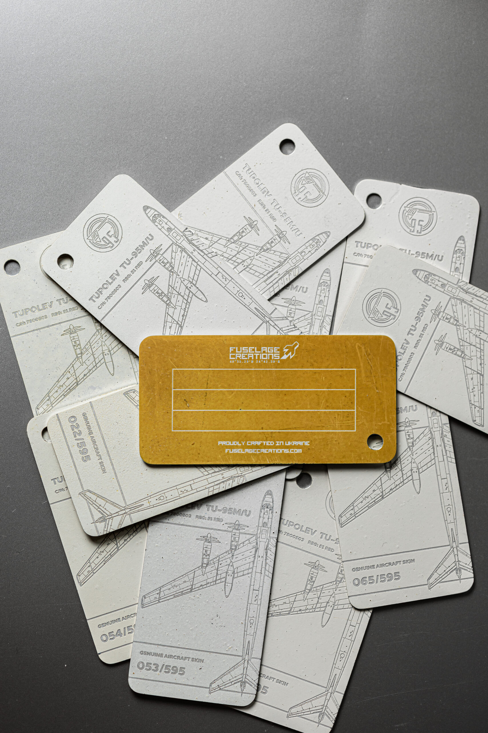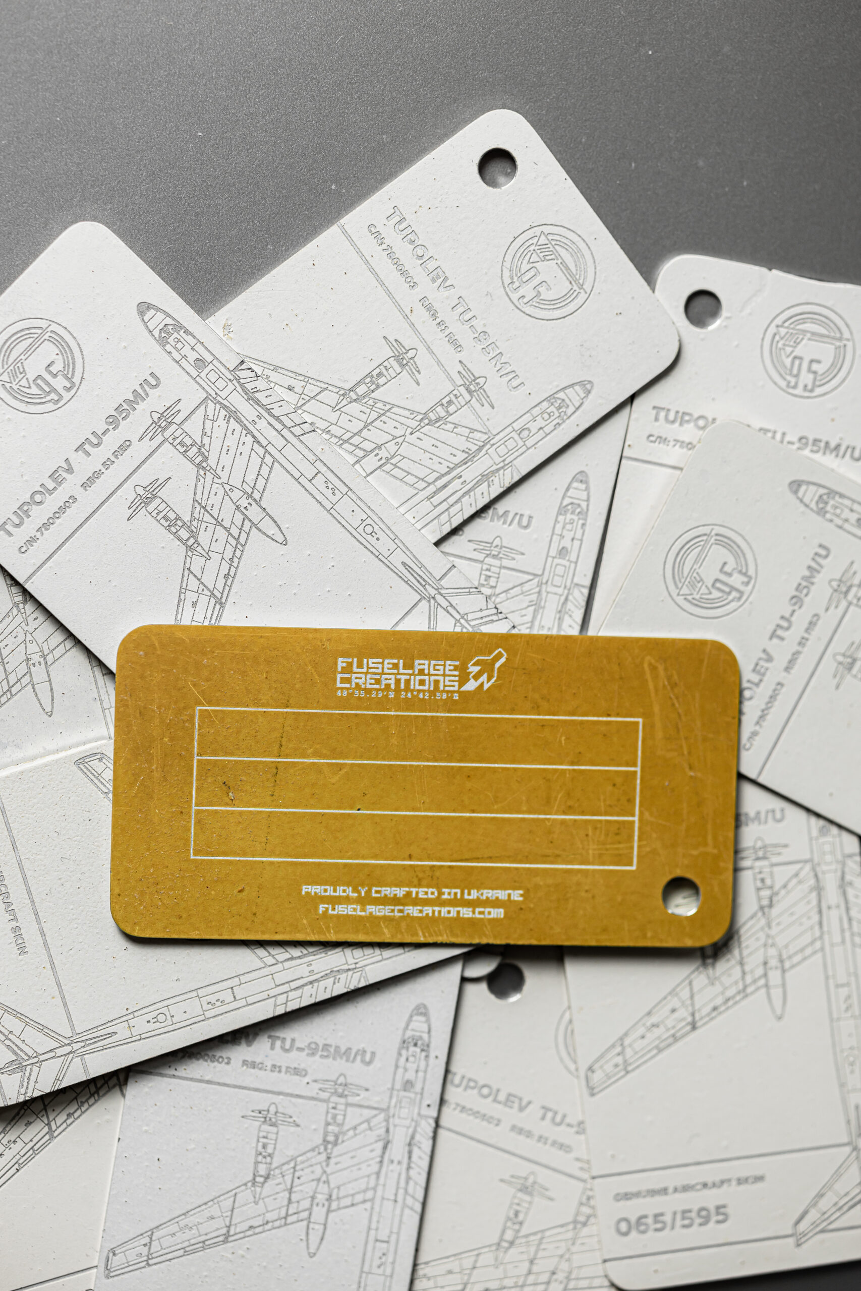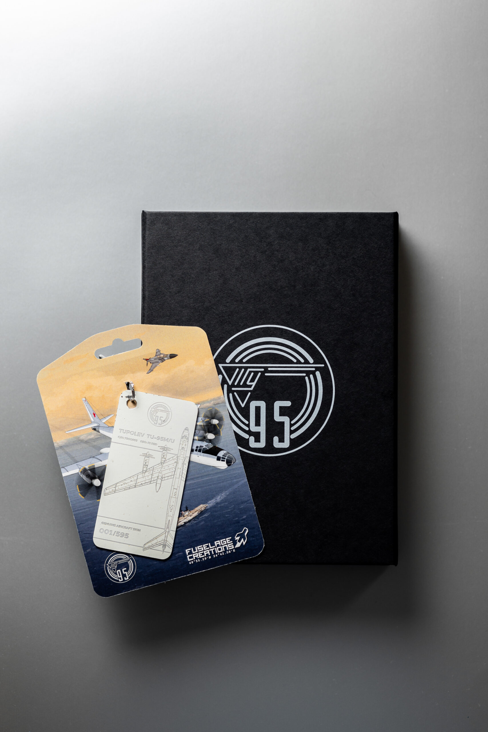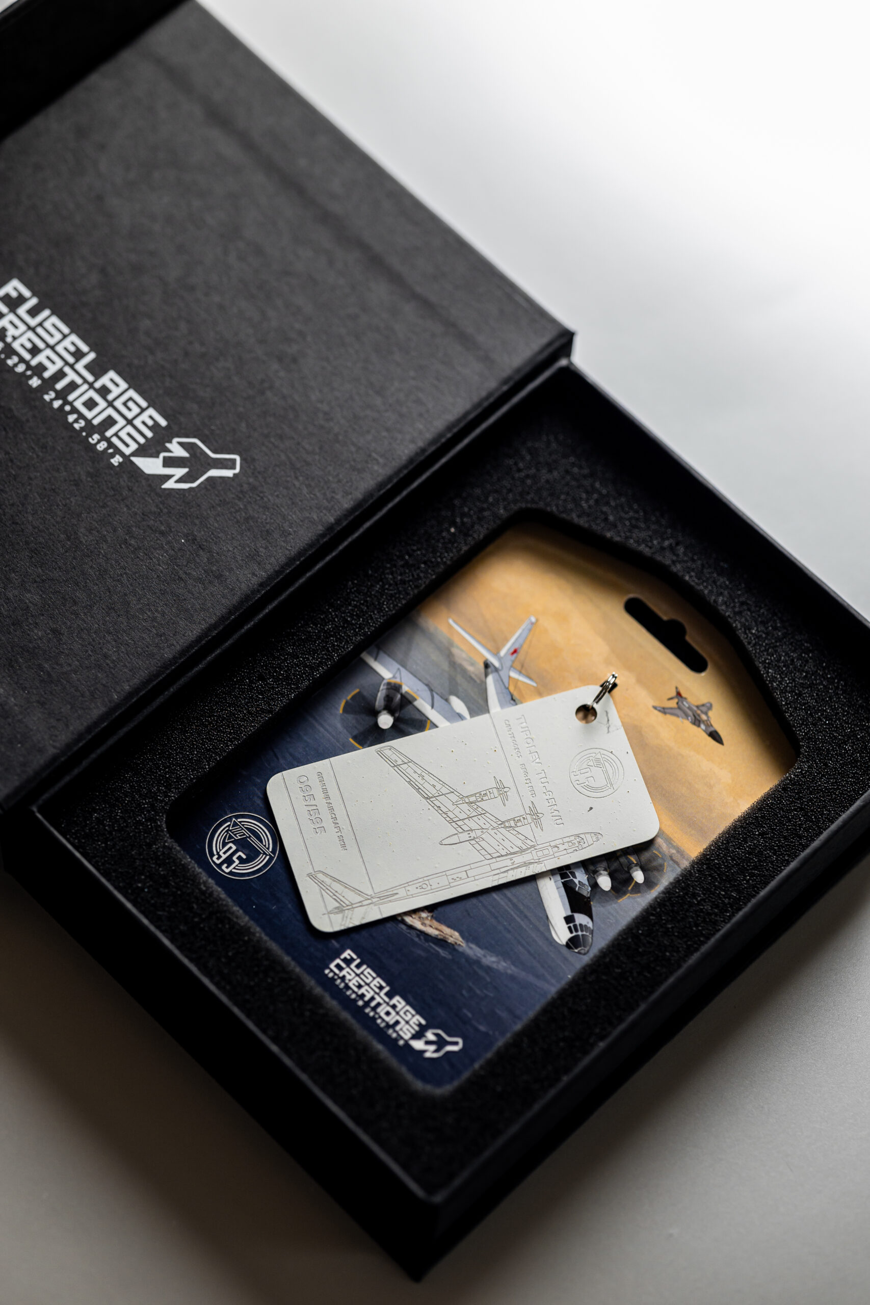 The tag in your possession has been crafted from the tail rudder of one of only two remaining TU-95M aircraft in the world. The TU-95M (Bear-A), with factory number 7800503 and military designator 51, was manufactured on 28 February 1958. Shortly after, the aircraft was delivered to the 409th Heavy Bomber Aviation Regiment, stationed at Uzyn Air Base (Ukrainian Soviet Socialist Republic).