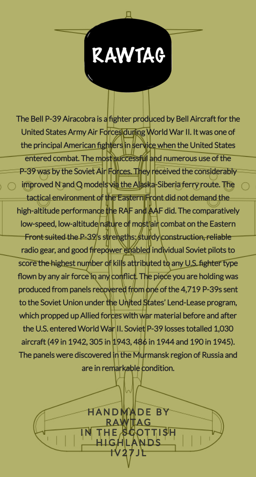 The Bell P-39 Airacobra is a fighter produced by Bell Aircraft for the United States Army Air Forces during World War 2. It was one of the principal American fighters in service when the United States entered combat. The most successful and numerous of the P-39 was by the Soviet Air Forces. They received the considerably improved N and Q models via the Alaska-Siberia ferry route. The tactical environment of the Eastern Front did not demand the high-altitude performance the RAF and AAF did. The comparatively low-speed, low-altitude nature of most air combat on the Eastern Front suited the P-39s strengths: sturdy construction, reliable radio gear and good firepower enabled Soviet pilots to score the highest number of kills attributed to any U.S fighter type flown by any air force in any conflict. The panel used for these tags was recovered from one of the 4,719 P-39s sent to the Soviet Union under the lend-lease program. The panels were discovered in the Murmansk region of Russia and are in remarkable condition. All paint is original and authentic. Truly a special release for RAWTAG!