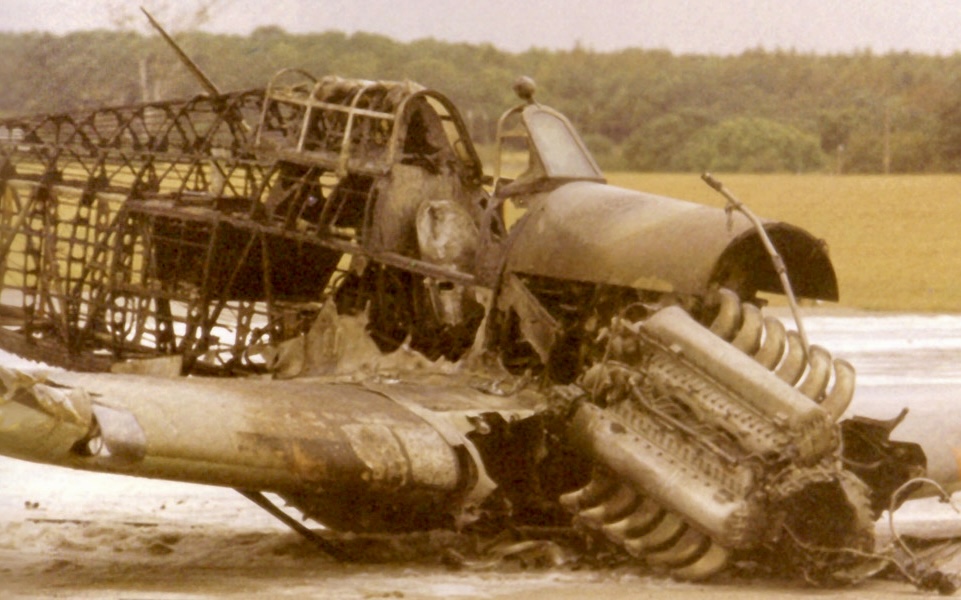 On 11th September 1991 Hurricane LF363 was enroute to Jersey when its engine suffered a camshaft failure. The pilot attempted to force land the aircraft but unfortunately the engine failed completely and the Hurricane stalled and crashed onto an airfield with the undercarriage still retracted. It was soon engulfed in flames. The pilot was able to scramble out and was fortunate to escape with a broken ankle and minor burns.