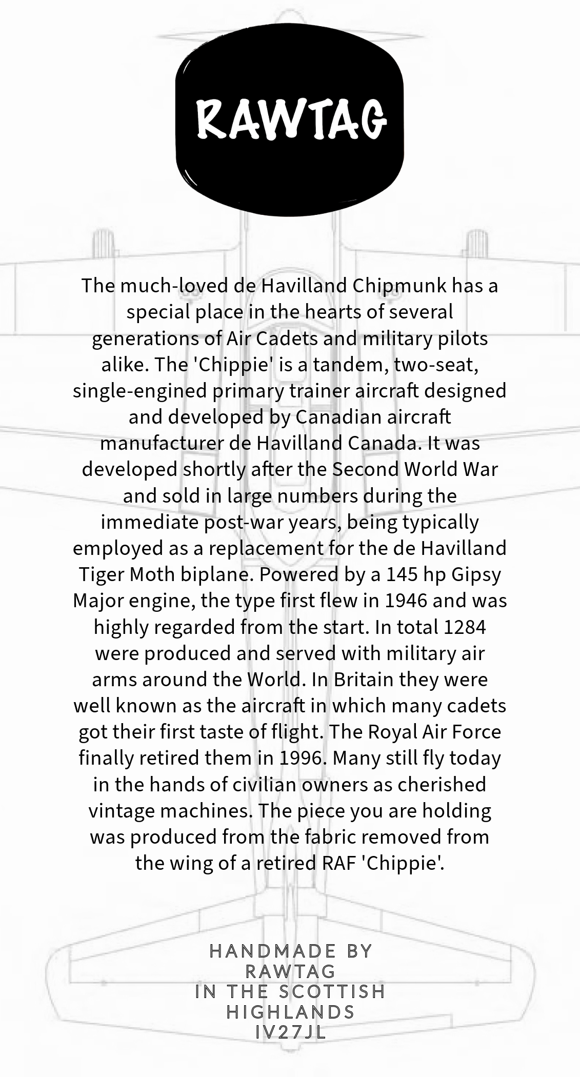 The tags on offer here were produced from wing fabric removed from a retired RAF ‘Chippie’.